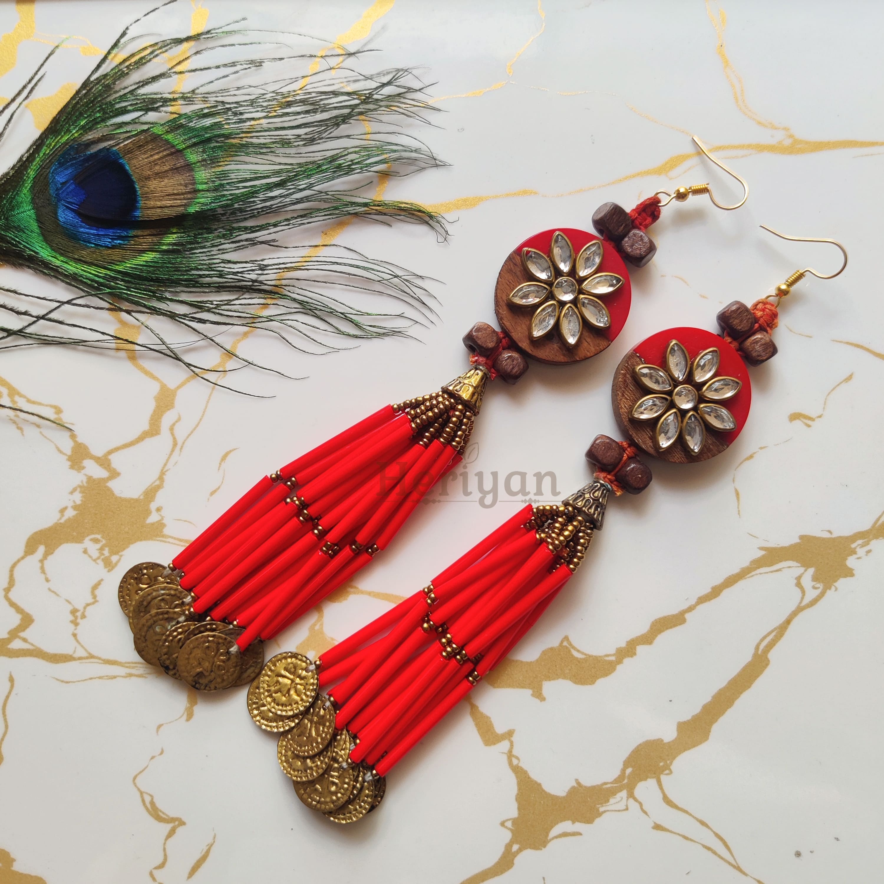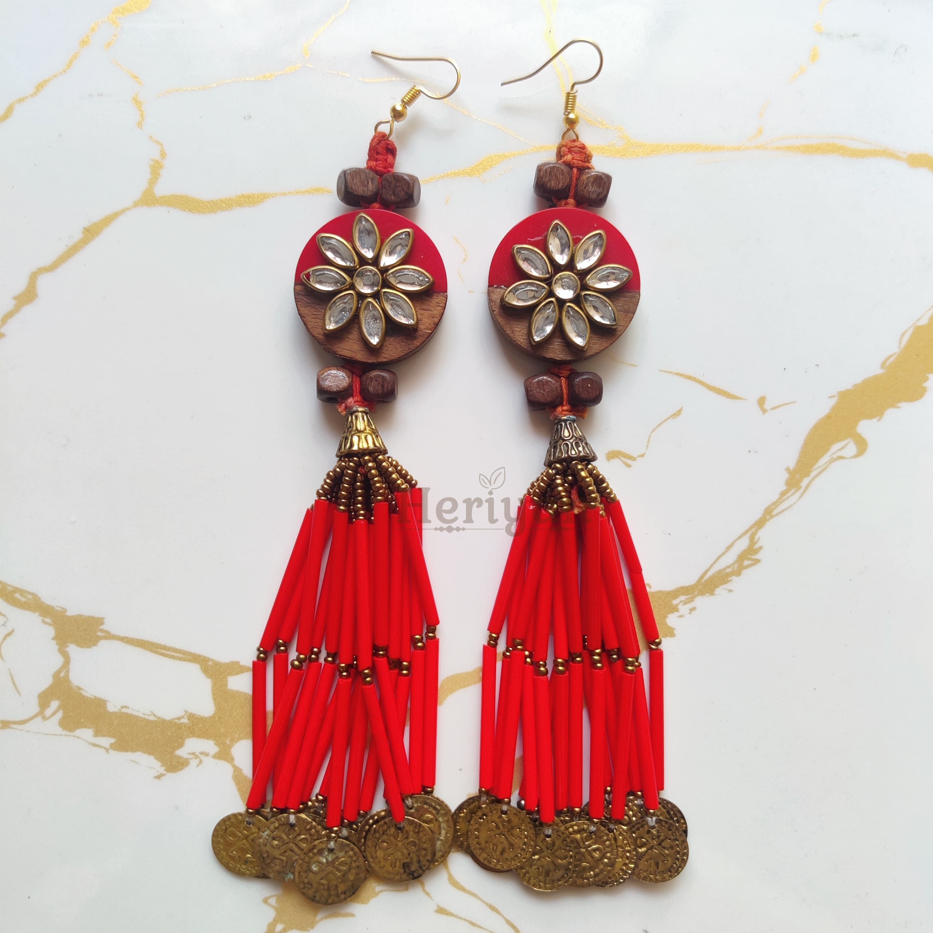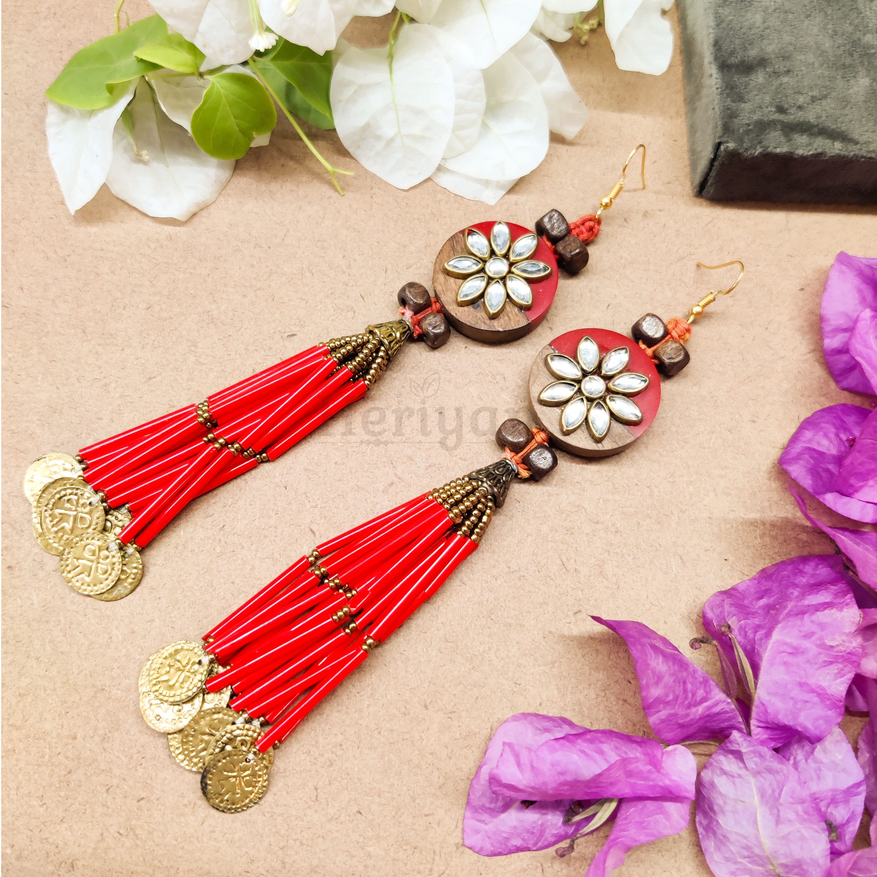 Red Long Boho Beaded Tassel Fringe Earrings Earrings