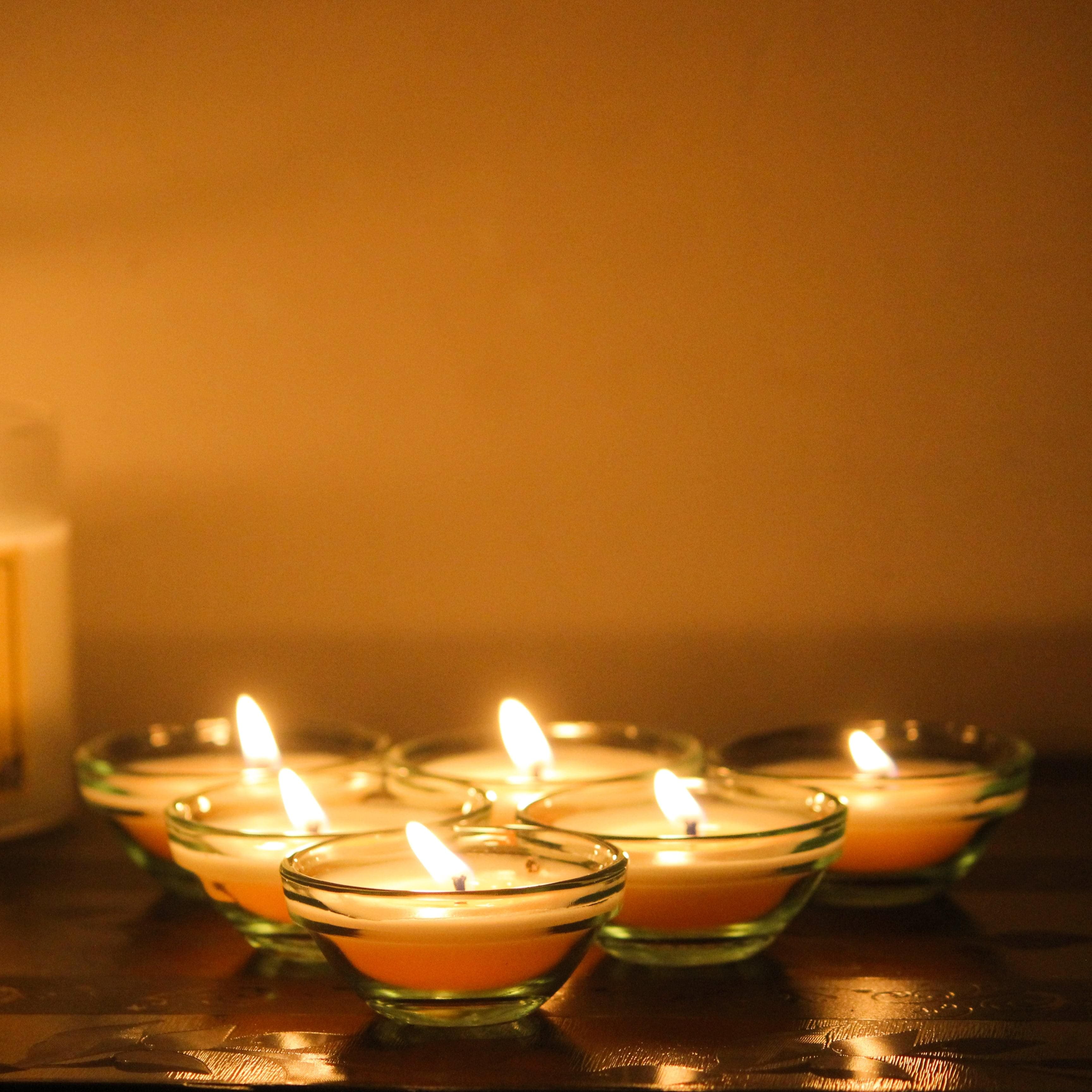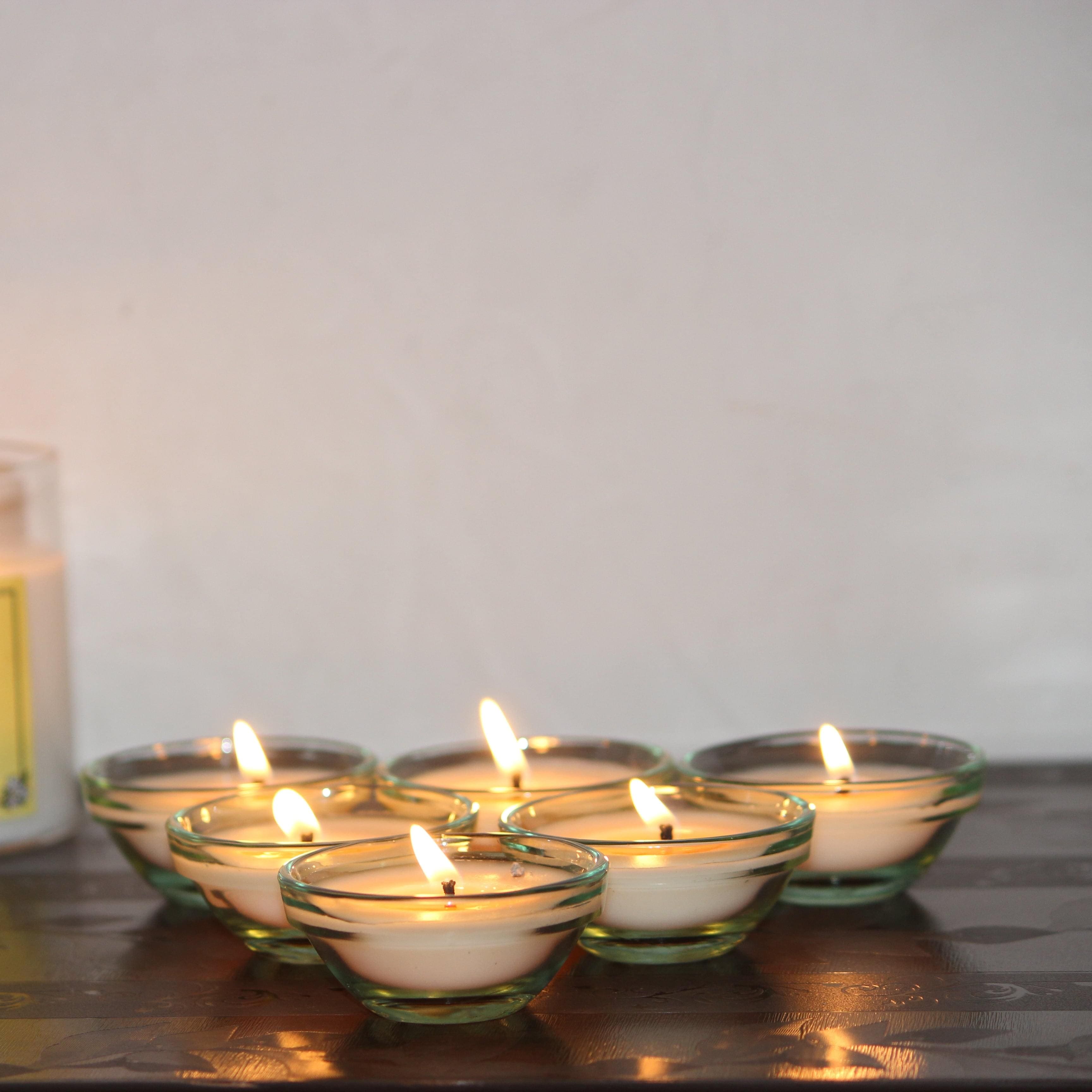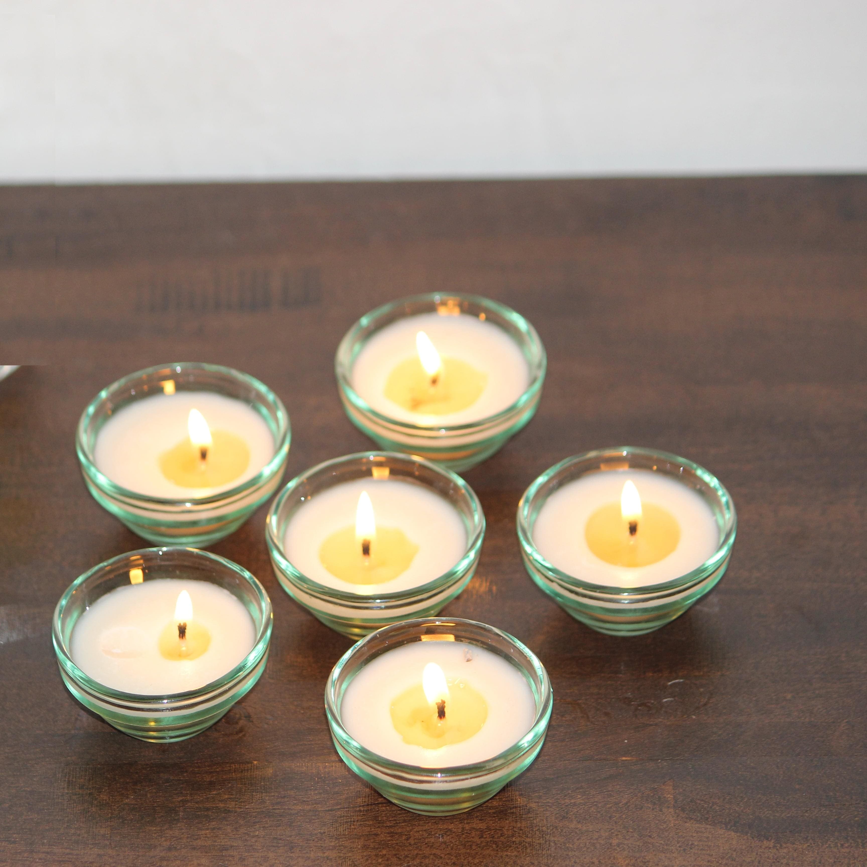 Small Glass Bowl Diya Scented Candle From Premium Glass Candle Collection.INGREDIENTS: Our Candles are made using an 100% Natural Soy Wax, Lead-Free Cotton Wick and fragrance Oils to give you a constant smell from the beginning to the end of the candle.
