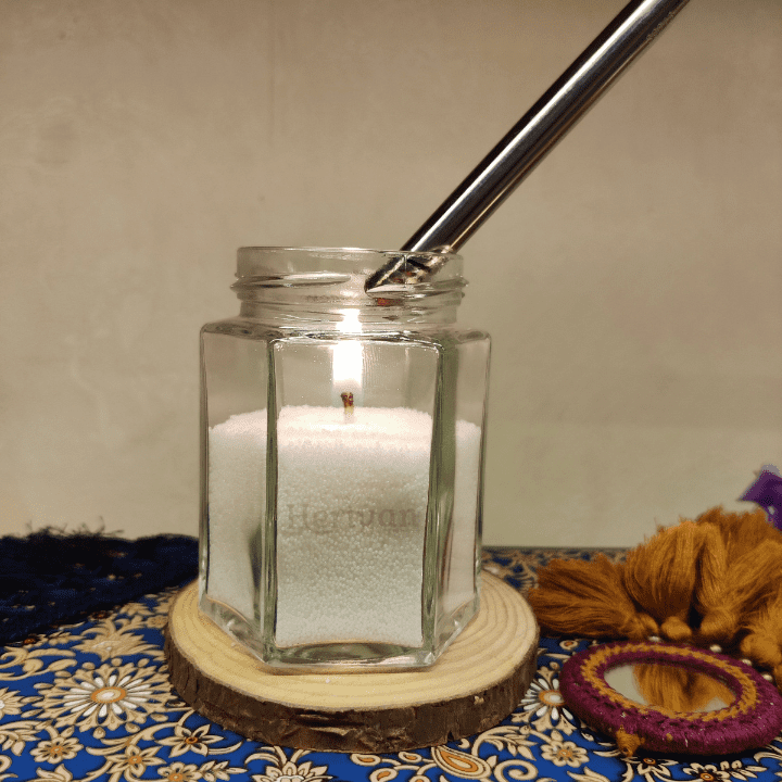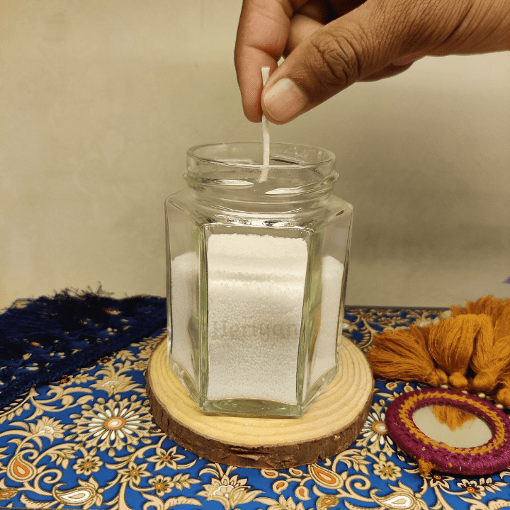 2) Insert the wick into the middle but leave 1/4” out of wax granules according the brightness you want.