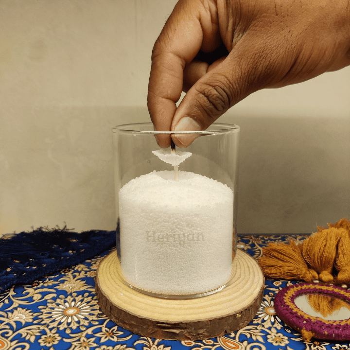 2) Insert the wick into the middle but leave 1/4” out of wax granules according the brightness you want.